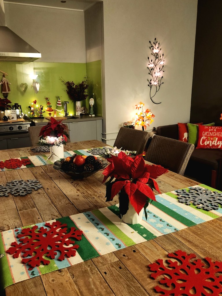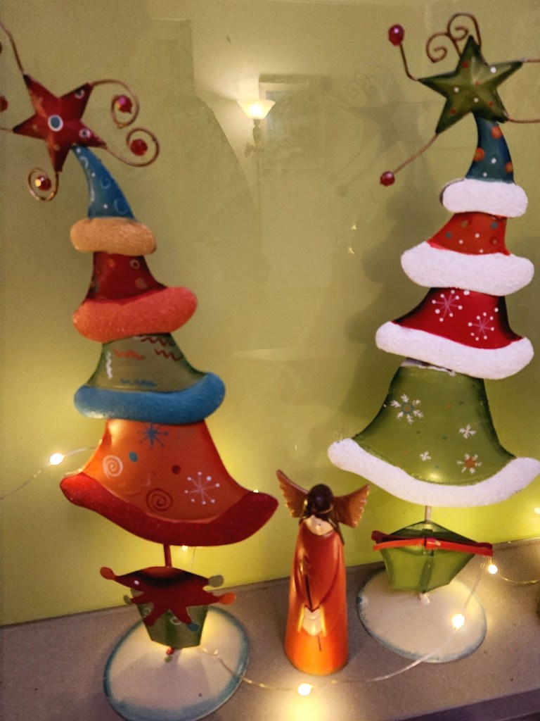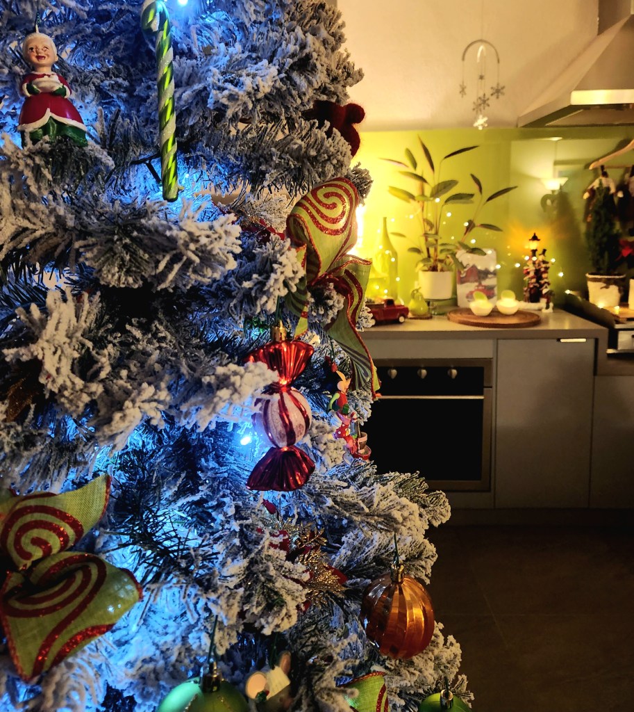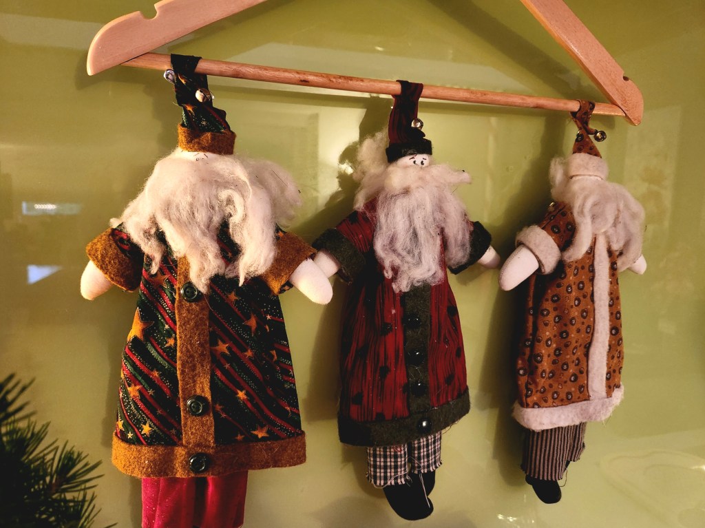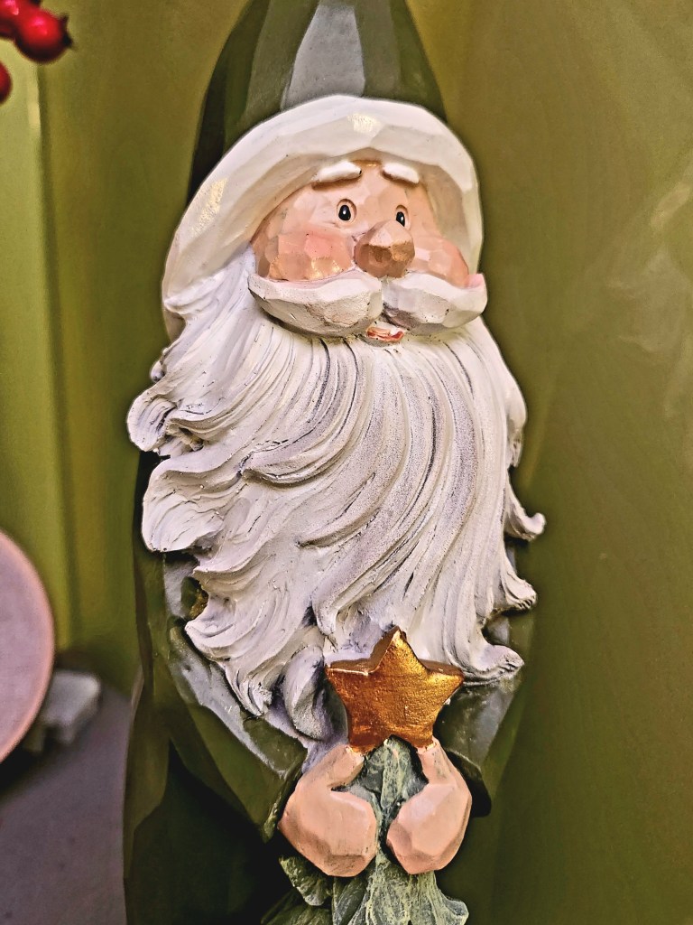 One of my favourite new additions is a green Santa holding a tree, a treasure I found during a female family shopping tour—such a fun memory!