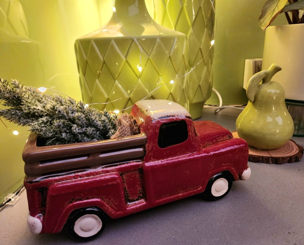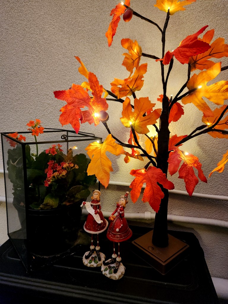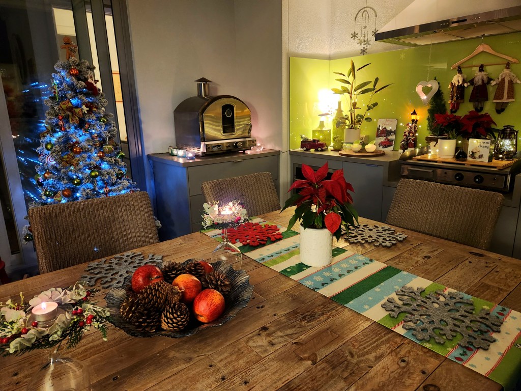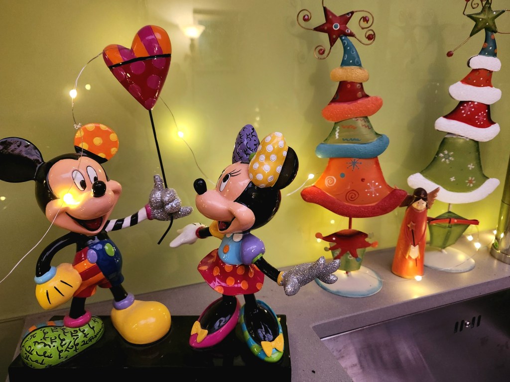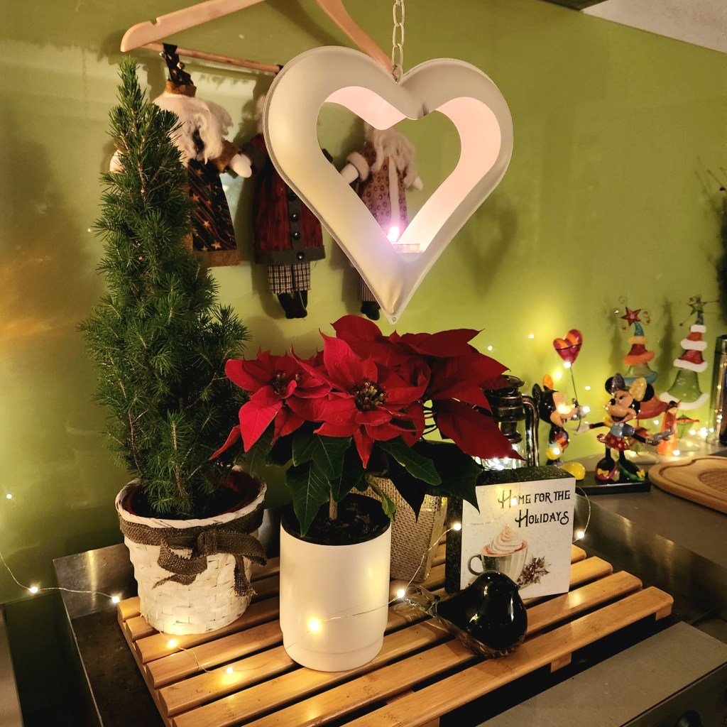 One of my favourite new additions is a green Santa holding a tree, a treasure I found during a female family shopping tour—such a fun memory!
