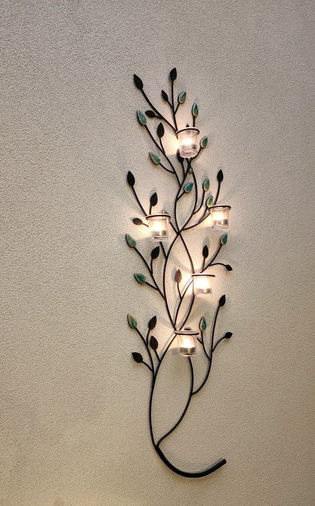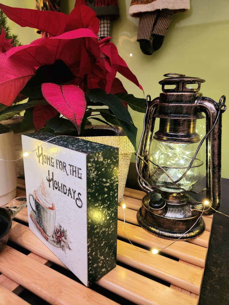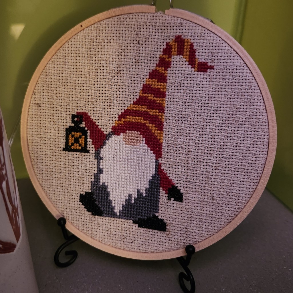 A cross-stitch of an elf with a lantern, also made by my clever daughter, stands proudly in a corner.
