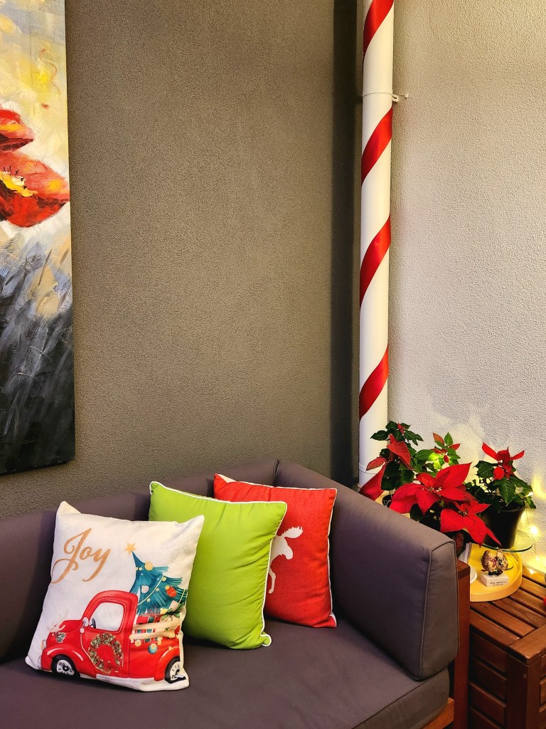 In the corner of the courtyard stands my extra-long candy cane pole, a whimsical statement piece.