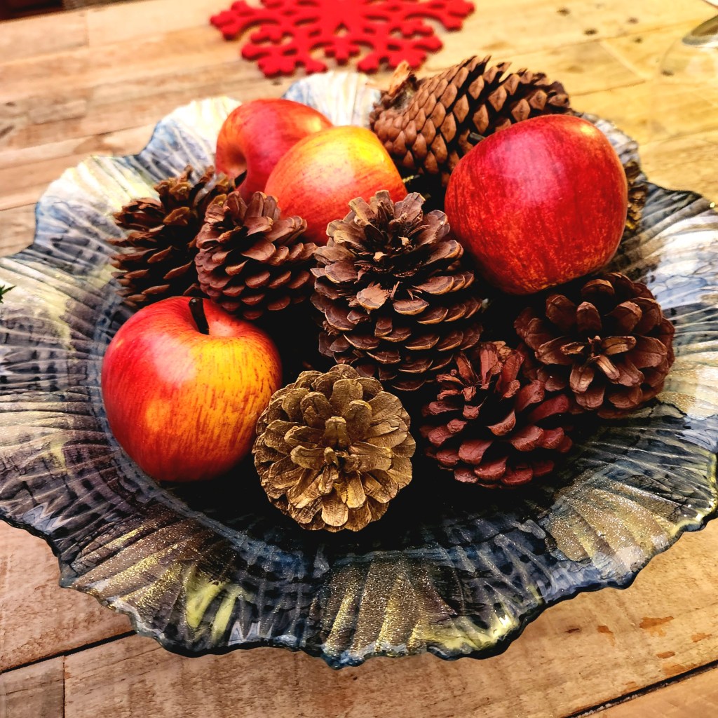 Apples, pinecones, and whimsical tree decorations add texture and charm, tying the theme together.