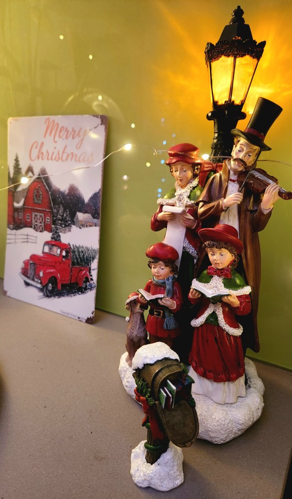 Beneath a charming lamppost stands a special statue of singing carolers, a gift from my dear friend Lynne, a piece that holds a special place in my heart.