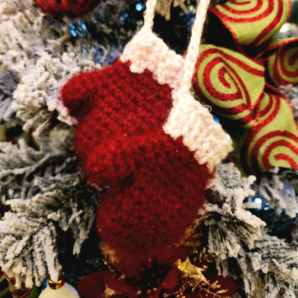 The tree is adorned with handmade treasures, including a pair of mittens lovingly crafted by my daughter.