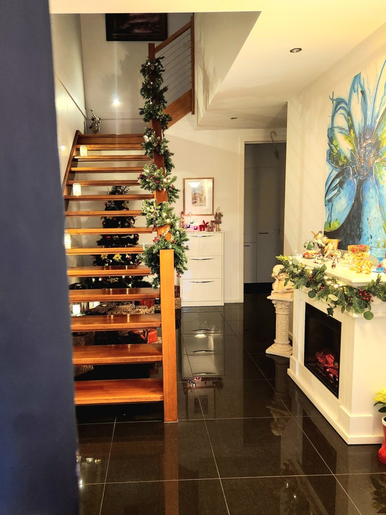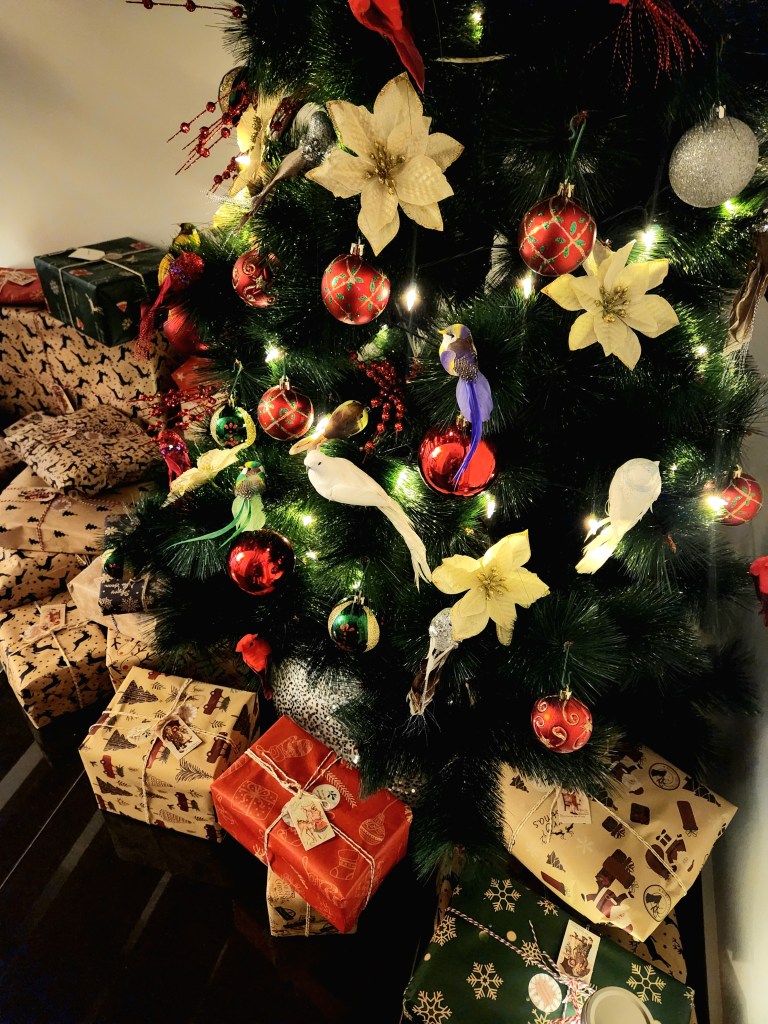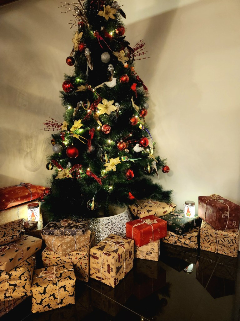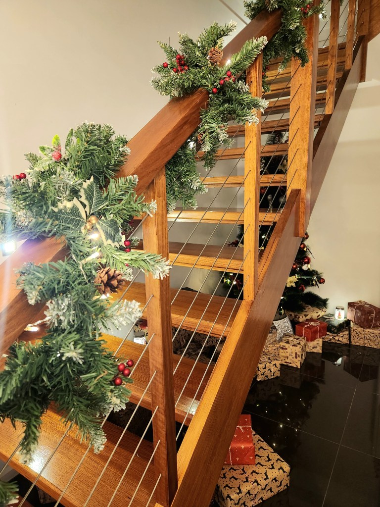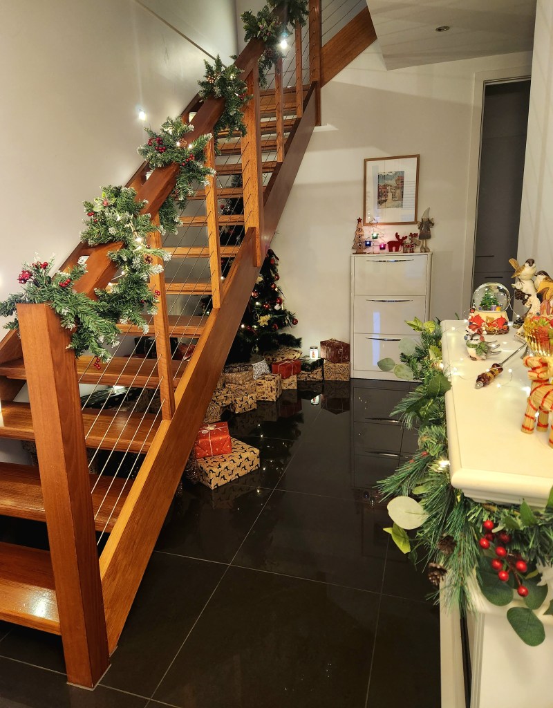 Under the staircase, our Christmas tree sparkles with twinkling lights, its branches heavy with ornaments and surrounded by presents just waiting to be unwrapped.