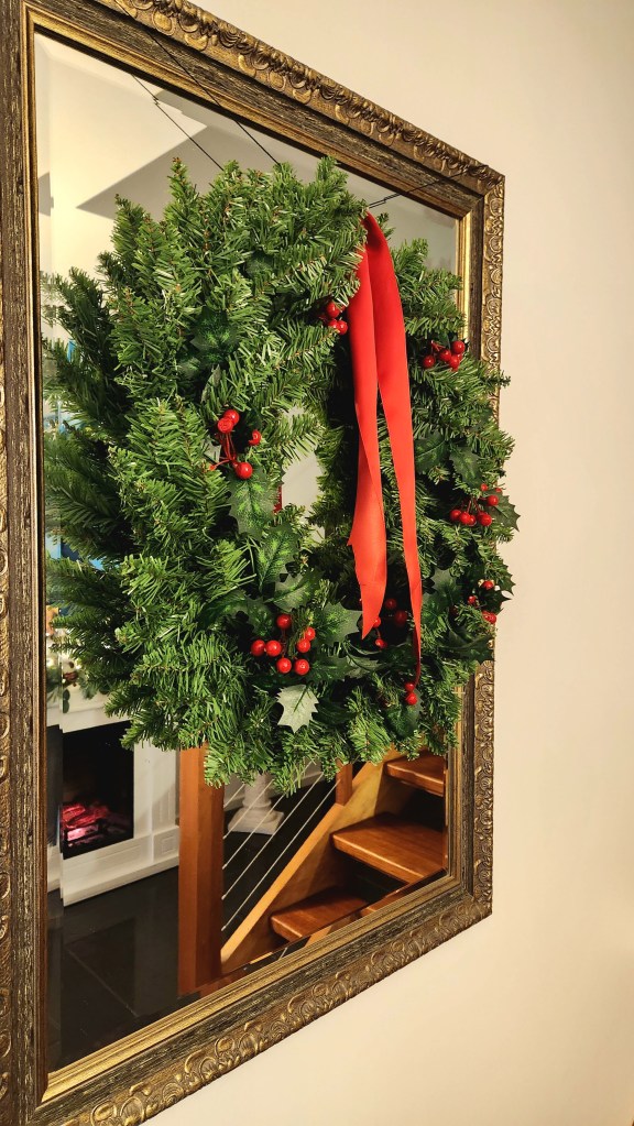 A beautiful wreath hangs proudly against the mirror, reflecting the soft glow of the garland that winds its way up the staircase railing like a trail of Christmas joy.
