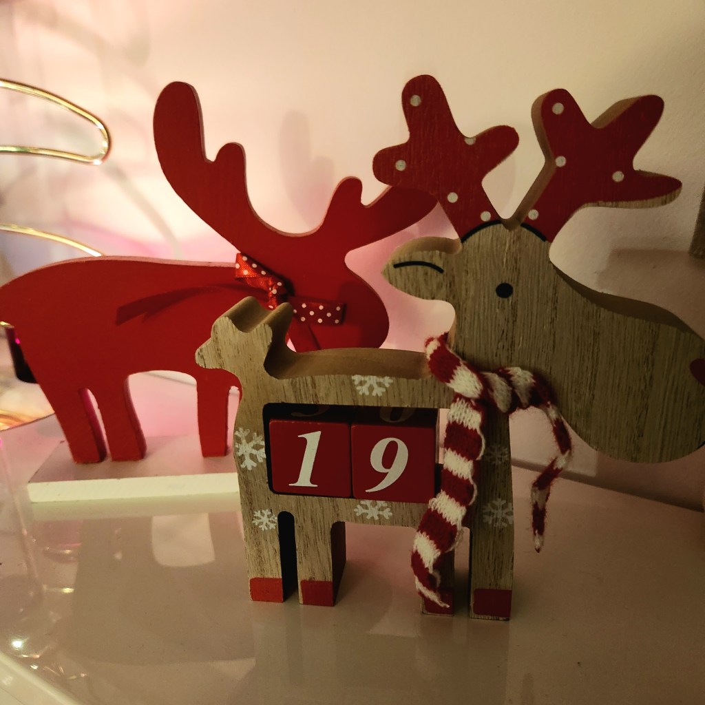 Beside them, the wooden reindeer keeps count of how many sleeps remain until the big day.
