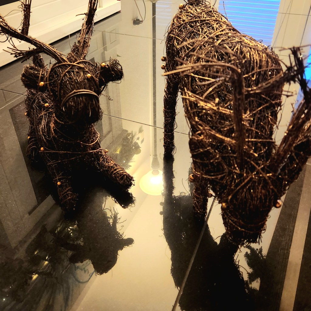 Reindeer stand proudly under the stairs, their antlers reflecting the light—a special gift from my daughter many, many years ago.