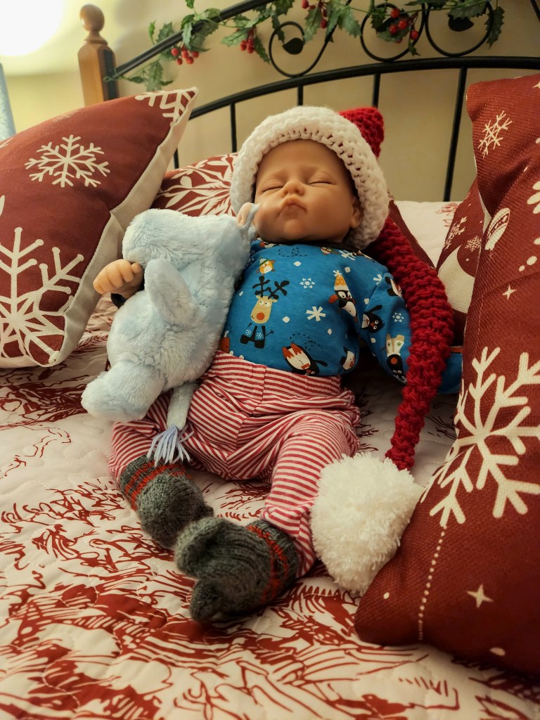 Audrey delights in wearing her extra-long Santa hat, cuddling her favourite Moomin toy, and showing off her Finnish woolen socks and reindeer top.