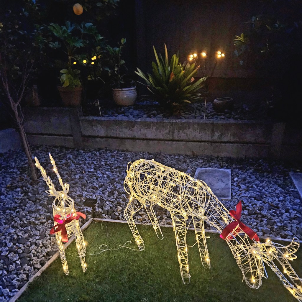 Outside, the Christmas magic spills into the backyard, where two illuminated reindeer—Dasher and Dancer—graze contentedly on the green grass, visible from the window.