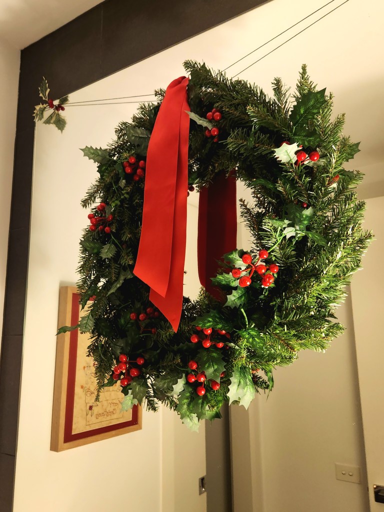 A large, homemade wreath hangs boldly, even if it does make the mirror a bit of a challenge to use—hahaa!